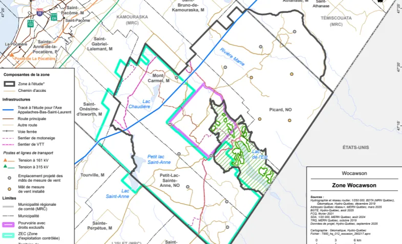 La zone de développement éolien Wocawson est située à cheval sur les territoires des MRC de Kamouraska et de Témiscouata. On y trouve les territoires non organisés (TNO) Petit-Lac-Sainte-Anne et Picard ainsi qu’une partie des territoires des municipalités de Mont-Carmel et de Saint-Athanase. Ce secteur d’à peu près 700 km² représente une capacité éolienne potentielle d’environ 1 000 MW.